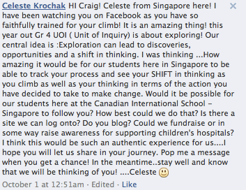 A surprise to me was the connections I made with other schools who followed my journey to the mountain and trek to the top. It was fantastic to go impact my local community and share the experience on a global level. With the permission of the writers, here are a few of the connections people made with my climb.