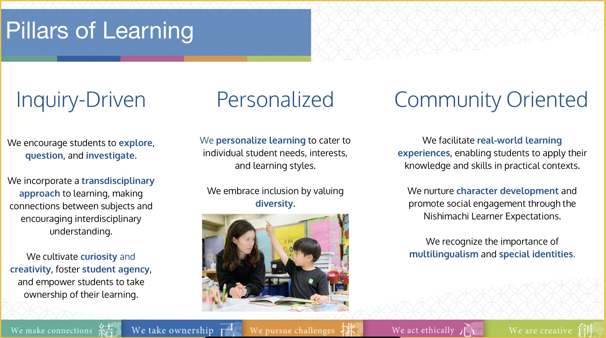 Through the creation of the most recent strategic plan, seven principles of learning rose to the top of what Nishimachi does, and aspires to be. These principles arose out of research into what skills and competencies are going to be needed in the future of work, best practices of top international schools, and a reflection of the current practices at Nishimachi. These seven principles have been categorized into the Three Pillars of Nishimachi learning.